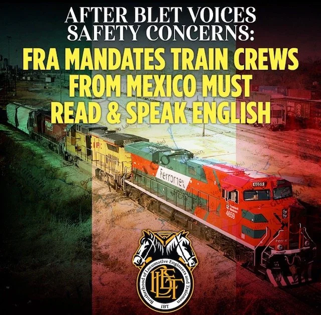 On Friday, December 19, on an issue of great importance to BLET members and following direct outreach from BLET National President Mark Wallace, U.S. Transportation Secretary Sean P. Duffy announced that the Federal Railroad Administration (FRA) is cracking down on the cross-border train operations of both Union Pacific (UP) and Canadian Pacific Kansas City (CPKC). FRA has determined that a lack of basic English language proficiency exhibited by Mexican train crews operating trains into the United States for the two railroads poses a serious safety risk.
