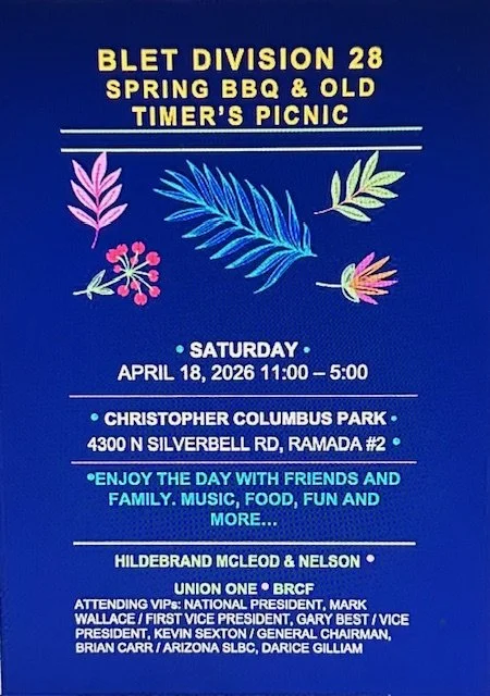 BLET Division 28 Spring BBQ & Old Timer's Picnic Thursday, March 19, 2026 8:30 AM 9:30 AM 08:30 09:30 BLET Division 28 877 South Alvernon Way Tucson, AZ, 85711 United States (map) Google Calendar ICS